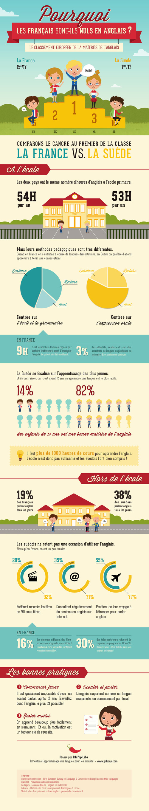 En Europe, la France est classée 15ème sur 17 sur son niveau en anglais. Une infographie compare le niveau de la France à celui de la Suède (leader européen sur son niveau d’anglais).